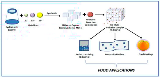 - Shen, M.; Liu, D.; Ding, T. Cyclodextrin-metal-organic frameworks (CD-MOFs): Main aspects and perspectives in food applications. Curr. Opin. Food Sci. 2021, 41, 8–15. [Google Scholar] [CrossRef]