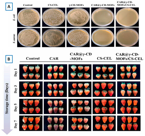 | γ-CD MOF | Carvacol | Chitosan–Cellulose(CS-CEL) active packaging film | CS-CEL films containing Carvacol-γ-CD MOF showed the lowest weight loss in strawberries compared to other conditions. Also, Carvacol-γ-CD-MOFs/CS-CEL composite film showed the lowest firmness loss, highest TSS value, and lowest pH change. | [61] |