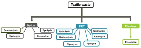 This manuscript will focus on reviewing the most recent results in the chemical recycling process of polyethylene terephthalate (PET), nylon, and elastane textiles; these polymers account for over 80% of the synthetic materials discarded in textile waste [44,45]