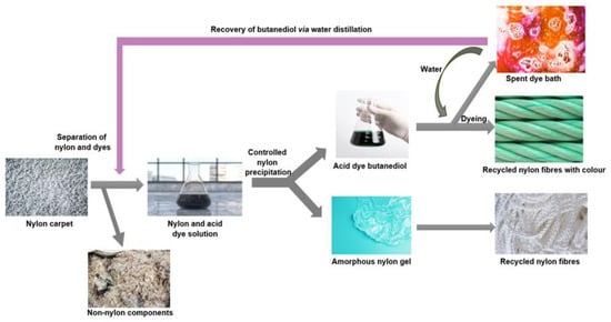 - Mu, B.; Shao, Y.; Yu, X.; McBride, L.; Hidalgo, H.; Yang, Y. High-quality separation and recovery of nylon and dyes from waste carpet via non-destructive dissolution and controlled precipitation for sustainable recycling. Sep. Purif. Technol. 2024, 332, 125801. [Google Scholar] [CrossRef]