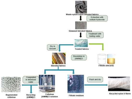 - Lv, F.; Wang, C.; Zhu, P.; Zhang, C. Isolation and recovery of cellulose from waste nylon/cotton blended fabrics by 1-allyl-3-methylimidazolium chloride. Carbohydr. Polym. 2015, 123, 424–431. [Google Scholar] [CrossRef]