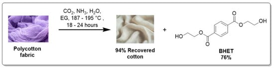 Glycolysis has been industrially used for the recycling of colourless waste bottles [162]. However, despite the high efficiency of glycolysis in recycling polyester waste from single-polymer components, the application of this approach for recovering BHET from waste polyester textiles can be quite challenging due to the heterogeneity of waste polyester textiles. For example, waste textiles are generally composed of blended fibres and contain variable contaminants such as pigments, dyes, dispersants, and various fabrics [163,164,165,166]. Some condensed polymeric fabrics can be converted to the corresponding products during the glycolysis of PET, and these products may further react with the target product BHET to produce second-generation products, which would decrease the purity of the recovered BHET. Therefore, appropriate pre-treatment prior to glycolysis to separate blended fabrics into pure components is essential for the efficient recycling of waste PET textiles. However, this prior separation of the constituent fibres significantly increases the cost of the method. Yang et al. reported a practical and scalable approach for recycling of PET and PET/cotton interwoven fabrics via catalytic glycolysis with ammonium bicarbonate, which decomposes to ammonia, CO2, and water [101]. This catalytic approach outperformed conventional acid/base and metal catalysis in selectively recovering and upcycling cotton-based materials. From their studies, they obtained high-purity BHET, which was thermally repolymerised to PET. This method offered a traceless, environmentally friendly, and practical approach for polyester recycling and cotton recovery, representing a significant step toward a sustainable, closed-loop production of plastics and textiles. Similarly, Liu et al. reported the recycling of full components of polyester/cotton blends catalysed by betaine-based eutectic solvents [167]. Polycotton and 100% PET fibre were used in the study and the experiments were performed at a specific temperature and time under atmospheric pressure. PET fibre was fully degraded to afford BHET in 85% yield which could be repolymerised to produce PET, and 95% of the cotton was recycled and maintained its original structural integrity.
