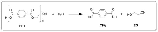 Hydrolysis is a chemical breakdown process that occurs due to a reaction with water. Hydrolysis of PET (Scheme 2) affords the degradation of the polymer into terephthalic acid (TPA) and ethylene glycol (EG) [113]. Hydrolysis of waste PET can be carried out under neutral, acid, and alkaline conditions to afford TPA and EG as products [114].