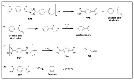 (a,b) Thermal pyrolysis of PET and benzyl acid vinyl ester; (c,d) catalytic steam pyrolysis of PET and TPA [181].