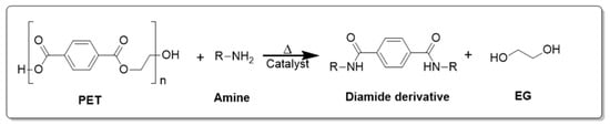 Aminolysis is a chemical recycling process of PET that has been little explored as compared to other chemical recycling processes. The aminolytic modification processes of PET fibre surfaces are frequently conducted using primary amines such as ammonia, methylamine, ethylamine, and butylamine to generate terephthalamide derivatives (Scheme 6) [183,184]. Other less commonly used amines include ethanolamine and triethylenetetramine.
