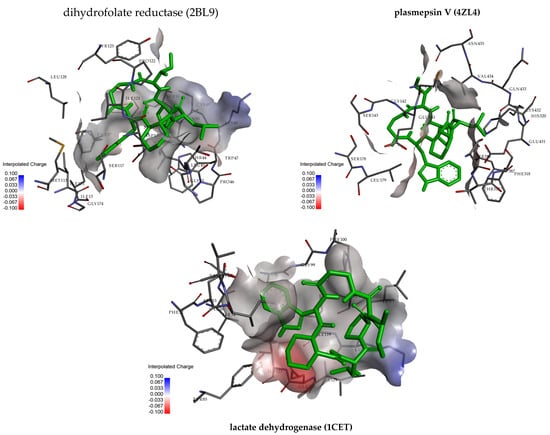 The docking of the pipecolisporin compound was conducted using Autodock Tools version 1.5.6. The three-dimensional structures of dihydrofolate reductase (2BL9) [42], plasmepsin V (4ZL4) [43], and lactate dehydrogenase (1CET) [44] were sourced from the Protein Database (PDB) (https://www.rcsb.org/) (accessed on 18 September 2024) and converted into pdbqt format prior to docking. The proteins 2BL9, 4ZL4, and 1CET were precisely prepared by incorporating polar hydrogens, Kollman charges, and calculating fragment volumes [45]. Furthermore, specific grid boxes—2BL9 (64.00, 70.00, 60.38), 4ZL4 (70.99, 71.13, 70.93), and 1CET (60.903, 75.211, 50.674)—were defined to encompass the active sites of the respective proteins. With the aid of the auto-grid tool, grid parameter files were generated for the docking setup. Throughout the process, both the ligand and protein were treated as flexible entities. The docking results identified the most favorable binding position with the highest docking score for further analysis.