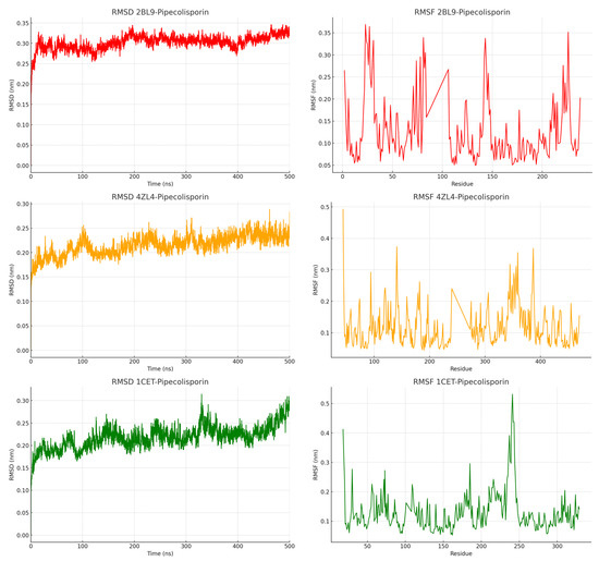 Molecular dynamics (MD) simulations were performed on the ligand–protein complexes 2BL9, 4ZL4, and 1CET to examine their structural behavior over a 500 ns timespan. The key analyses included root-mean-square deviation (RMSD), root-mean-square fluctuation (RMSF), Solvent-Accessible Surface Area (SASA), and Radius of Gyration (rGy). RMSD plots for all three complexes demonstrated that after an initial stabilization period of around 50 ns, the proteins maintained stable structures with fluctuations between 0.20 nm and 0.35 nm (Figure 3). This stability indicates that the proteins did not undergo significant structural deviations, suggesting that they are conformationally stable. RMSD for 2BL9 was slightly more volatile early on, but all three complexes reached equilibrium and maintained their structures throughout the simulations. The RMSF plots revealed that certain regions of the protein, particularly in the 2BL9 and 4ZL4 complexes, exhibited higher levels of fluctuation between residues 50 and 150. These fluctuations suggest potential flexible regions in the protein structure, while the rest of the complexes showed lower fluctuations. In comparison, the 1CET complex exhibited smaller RMSF peaks, particularly in the 200–250 residue range, suggesting that 1CET remained structurally more rigid than the other two complexes.