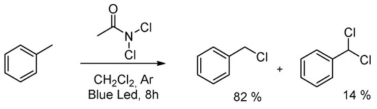In a round-bottom flask of 10 mL, we added 2 mmol of alkylarenes and 1.3 mmol (0.166 g) of N,N-dichloroacetamide in 1 mL of dichloromethane under a dry argon atmosphere at room temperature. The resulting suspension was irradiated under a blue LED, under stirring, for 8 h. The reaction was monitored by TLC. After 8 h, the crude mixture was purified by short-column chromatography (diameter = 4 cm with 18 g of silica gel, Hexane/AcOEt). Detailed experimental steps and NMR results can be viewed in the Supplementary Materials.
