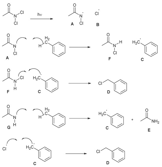 The reaction starts with the homolytic cleavage of the N–Cl bond of N,N-dichloroacetamide to generate radical chlorine atom B and nitrogen-centered radical A [45,46,47]. Then, the process propagates via the abstraction of toluene’s hydrogen by A to generate intermediate benzyl radical C and N-chloroacetamide F. Then, acyl radical C reacts with N-chloroacetamide F to generate benzyl chloride D and nitrogen-centered radical F. Subsequently, nitrogen-centered radical F reacts with toluene to give benzyl radical C and acetamide E. Finally, benzyl radical C is quenched by the radical chlorine atom B to generate benzyl chloride D.