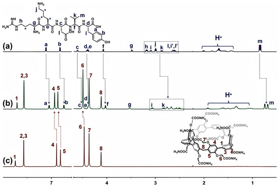 - Chen, L.-M.; Meng, Z.; Tian, L.; Zhang, Y.-H.; Zhao, L.; Du, X.-B.; Ma, M.-K.; Zhang, H.; Chen, J.-Y.; Meng, Q.-B. Complexation of specific residues by carboxylatopillar[6]arene for improving the zymolytic stability of arginine-containing peptides. Org. Biomol. Chem. 2022, 20, 2222–2226. [Google Scholar] [CrossRef]