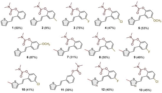 Previously tested resveratrol analogs [32] with a thiophene or thiazole ring on one side and a phenol ring on the other side of the stilbene moiety were converted into carbamates (Scheme 1, Figure 2). The inhibitory activity of newly prepared carbamates 1–13 was tested toward acetylcholinesterase (AChE) and butyrylcholinesterase (BChE). The assays were carried out using Ellman’s method [35] with minor modifications, and the results were expressed as IC50 values and presented in Table 1.