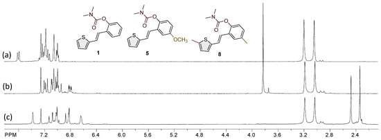 (E)-4-methoxy-2-(2-(thiophen-2-yl)vinyl)phenyl dimethylcarbamate (5): 69 mg (isolated 53%), brown oil; Rf (40% PE/E) = 0.34; 1H NMR (CDCl3, 300 MHz) δ/ppm: 7.23–7.13 (m, 2H), 7.09 (d, J = 2.8 Hz, 1H), 7.06–7.03 (m, 2H), 7.02–6.94 (m, 2H), 6.81 (dd, J = 8.7, 2.8 Hz, 1H), 3.83 (s, 3H), 3.19 (s, 3H), 3.03 (s, 3H); 13C NMR (CDCl3, 75 MHz) δ/ppm: 157.0, 155.0, 142.8, 132.7, 130.4, 127.6, 126.5, 124.6, 123.9, 123.6, 121.9, 114.1, 110.3, 55.7, 36.9, 36.5; HRMS (ESI) (m/z) for C16H17ClNO3S: [M + H]+calcd = 303.0929, and [M + H]+measured = 303.0936.