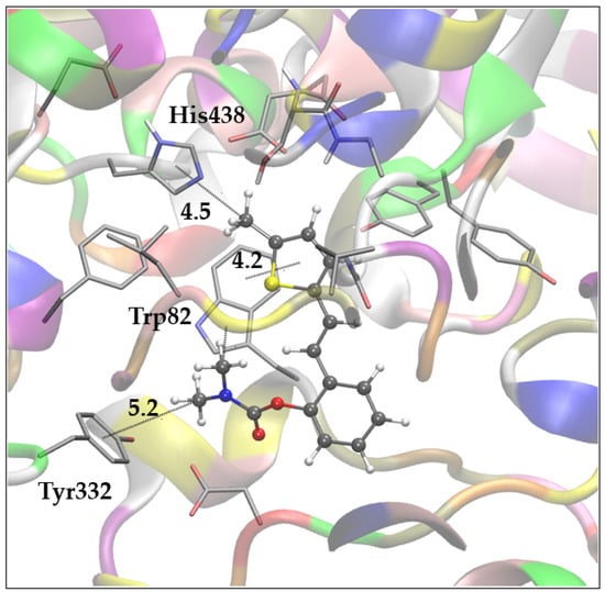 The complex of compound 7 with BChE, shown in Figure 6, is representative of the most stable and most populated cluster of poses obtained via docking. Here, the ligand adopts a conformation similar to that observed for compound 1 in Figure 5a. The carbamate group is oriented toward PAS, and the methyl groups of the dimethylamino fragment participate in alkyl-π interactions with Tyr332 and Trp82. Furthermore, one additional alkyl-π interaction is noted between the -CH₃ substituent on the thiophene ring and His438 in the esteratic site, while the thiophene ring maintains its interaction with Trp82 at the anionic site.