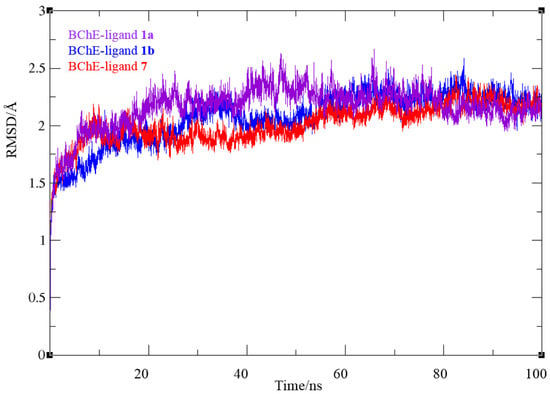 In all three systems, convergence was achieved after 30 ns. For the complexes with ligand 1, the RMSD values ranged from 0.78 to 2.67 for BChE-1a and to 2.59 Å (BChE-1b), averaging 2.16 (2.07) Å, respectively, with similar values for ligand 7 (0.81 to 2.44 Å, averaging 2.02 Å). The average RMSD for the final 70 ns decreased to 1.69 (1.89) and 1.90 Å for ligands 1 and 7, respectively. The RMSF analysis (Figure 8) revealed that in the BChE-1a (violet dotted line), the biggest value was 3.29 Å, corresponding to residue Gln484, while for the BChE-1b complex (blue line), the most mobile protein backbone regions were α carbons 7559 and 5786, corresponding to residues Asn485 and Trp376, with RMSF values of 4.50 and 3.61 Å, respectively. In the BChE–ligand 7 complex (red line), the highest RMSF (6.59 Å) was observed for Val529 (positioned at a distance of 24 Å from the active site, thus not influencing its structure), with the other residues showing significantly less mobility throughout the simulation.