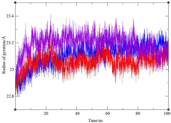 Values of a radius of gyration from molecular dynamics simulation of a protein–ligand complex of BChE with compounds 1 (violet for conformation 1a, and blue for 1b) and 7 (red line), respectively.