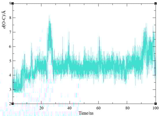 The optimal distance for the reaction to start should not exceed 4 Å [43,44]. Here, the O-C distance increases significantly after the first 25–30 ns, with initial values below 4 Å not being maintained. A favorable value of ~4 Å or less is present 14% of the time; even 60% of the time, this distance is greater than 4.5 Å. This variability may be attributed to the size of the ligand, which allows for more space within the relatively large active site. The fluctuations in the d(O-C) suggest that, despite the initial conformation appearing highly conducive for the nucleophilic attack of the serine oxygen on the ligand’s carbonyl carbon, the chemical reaction may not occur. However, further experimental measurements are needed to reach a definitive conclusion.
