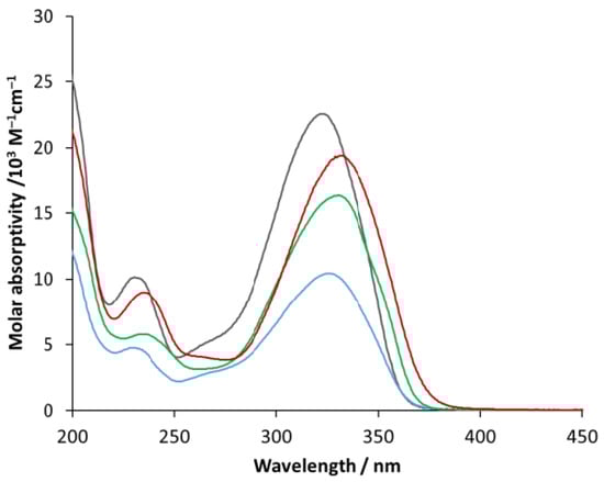 First, the absorption spectra of the selected ligands were recorded for spectrophotometric titration. Figure 11 shows the corresponding molar absorptivity spectra, which are very similar to each other from the viewpoint of the band positions. The shorter-wavelength bands (at about 233–238 nm) may be designated as thiophene-centered ones due to a π–π* transition. The longer-wavelength bands (at about 322–331 nm) belong to the whole 2-styryl thiophene moiety due to the conjugation of the two aromatic rings through the vinyl bridge. The substituents hardly influence the band positions; instead, they affect the molar absorptivities.