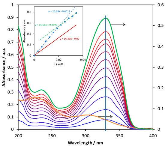 Difference absorption spectra obtained through titration of 1.93 × 10–5 M of Fe2(SO4)3 aqueous solution with compound 6 in the 0–0.35 mM concentration range. The orange curve is the spectrum of the starting pure Fe2(SO4)3 solution, while the green spectrum belongs to the pure ligand. The inset shows the changes in absorbance measured at 330 nm (blue) and the theoretical absorbance calculated for the ligand at the same wavelength (red) as a function of the concentration of 6.