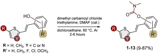 Analogs of resveratrol previously synthesized by our group [30,31,32] were used as the starting material for synthesizing carbamates 1–13 in dichloroethane (Scheme 1). At room temperature in an inert atmosphere, 1.8 eq of triethylamine and a catalytic amount of DMAP were added. After that, the reaction mixture was stirred under argon, followed by adding 2 eq of dimethylcarbamoyl chloride. In the end, the reaction mixture was worked up (see Section 3).