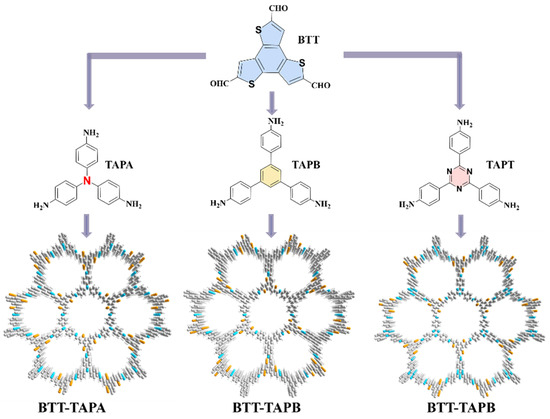 Three 2D covalent organic frameworks were obtained by the aldimine condensation between BTT and TAPA, TAPB, and TAPT, respectively. Detailed information on the chemical reagents, instruments, and methods used for polymer characterization is provided in the Supplementary Materials.