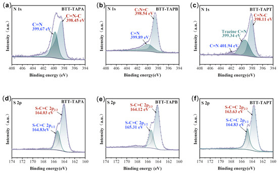 XPS spectra: (a–c) N 1s and (d–f) S 2p for BTT-TAPA, BTT-TAPB, and BTT-TAPT.