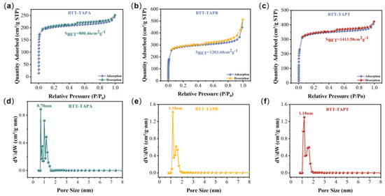N2 adsorption/desorption isotherms of (a) BTT-TAPA, (b) BTT-TAPB, and (c) BTT-TAPT. Pore distribution curves of (d) BTT-TAPA, (e) BTT-TAPB, and (f) BTT-TAPT.