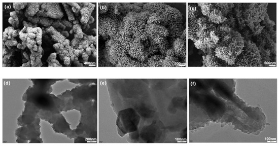 As shown in Figure 5, the morphologies and microstructure of BTT-based COFs were characterized by scanning electron microscopy (SEM) and transmission electron microscopy (TEM). Figure 5a shows that BTT-TAPA is composed of ginger-shaped aggregates, with small polyhedral particles attached to the surface. As depicted in Figure 5b,c, both BTT-TAPB and BTT-TAPT have a sea-urchin-like morphology. The petal-like rods of BTT-TAPT are sparser and longer than that of BTT-TAPB. The TEM images of BTT-TAPB and BTT-TAPT show that some packaging materials exist inside these materials. Especially, a regular hexagonal sheet-like particle is shown in Figure 5e, which can be attributed to the crystalline morphology of BTT-TAPB with a hexagonal system [48,49,50]. Figure 5f exhibits that BTT-TAPT has a large hollow tube, which means that BTT-TAPT has a larger specific surface area.