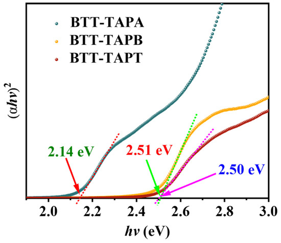 where α denotes the absorbance index, h is Planck’s constant, γ represents the frequency of light, A is the Coulomb constant, and Eg denotes the gap energy of the absorption band. The value of n depends on the type of semiconductor, where n = 1 and 4 represent direct and indirect transitions, respectively. By linear fitting graphs, it can be easily determined that n = 1. As shown in Figure 6, the band gaps of BTT-TAPA, BTT-TAPB, and BTT-TAPT were calculated to be 2.14, 2.51, and 2.50 eV, respectively, which are far less than those of classical photocatalysts TiO2 (3.2 eV) and ZnO (3.1 eV) [54]. Therefore, these BTT-based COFs are excellent candidates for visible-light-promoted catalysts [55].