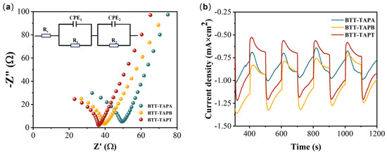 (a) EIS Nyquist plots of BTT-TAPA, BTT-TAPB, and BTT-TAPT with the simulated circuit diagrams shown in the inset. (b) Periodic on/off photocurrent responses of BTT-TAPA, BTT-TAPB, and BTT-TAPT under visible-light irradiation.