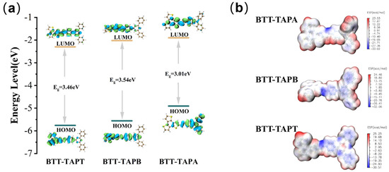 (a) Calculated orbital distributions of BTT-TAPT, BTT-TAPB, and BTT-TAPA. (b) ESP maps of BTT-TAPA, BTT-TAPB, and BTT-TAPT.