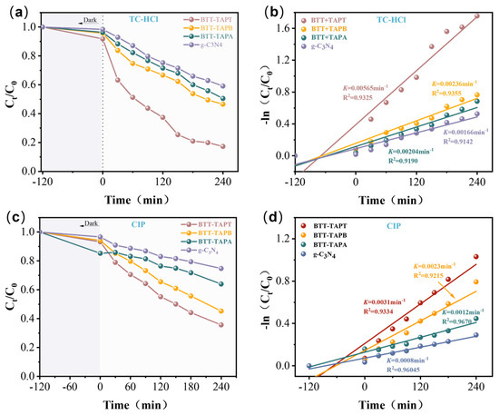 (a) Removal curves of TC (50 mg/L). (b) Pseudo-first-order reaction kinetics for the degradation of TC (50 mg/L) by BTT-TAPT (10 mg). (c) Removal curves of CIP (50 mg/L). (d) Pseudo-first-order reaction kinetics for the degradation of CIP (50 mg/L) by BTT-TAPT (10 mg).