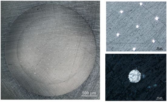 The research was conducted using a μAutolab analyzer (from ECO/Chemie, Utrecht, The Netherlands). A traditional three-electrode system was used, with the solid bismuth microelectrode array as a working electrode, an Ag/AgCl/NaCl reference electrode, and a platinum wire counter electrode. The volume of the voltammetric cell was 10 mL. The working electrode was constructed as described in detail in [45] in the course of the fabrication of a gold microelectrode array. Shortly, for the construction of the array of solid bismuth microelectrodes, a homemade silica preform containing about 169 holes, made in the Laboratory of Optical Fibers Technology at our university, was utilized. The outer diameter of the preform was equal to 3 mm. The holes have a circular shape with a diameter of about 19 μm. The minimal distance between holes was 130 μm. The holes in the preform were filled with melted bismuth using a procedure similar to that reported in [46,47]. Metallic bismuth was melted at a temperature of about 400 °C and then was pressed in the holes of the preform under a pressure of about 20 bars. Then, 6 mm of the preform filled with bismuth was placed in the PEEK housing of a diameter of 6 mm. An electrical contact from the solid bismuth microelectrode array was prepared using graphitized carbon black powder and a copper wire. In this way, an eco-friendly, durable, and long-term-use working microelectrode array was fabricated. The surface of the working solid bismuth microelectrode array was polished every day directly before the voltammetric measurements using sandpaper of 1500 and 2500 grit and then cleaned with deionized water in an ultrasonic bath in 30 s. A real image of the solid bismuth microelectrode array was taken using an MA200 Inverted Metallographic Microscope Nikon (Tokyo, Japan).