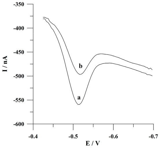 The adsorptive stripping voltammograms obtained for Sunset Yellow determination from (a) a stirred solution during a preconcentration step; (b) an unstirred solution during a preconcentration step. Potential and time of accumulation: −0.425 V, 60 s. The concentration of Sunset Yellow was 5 × 10−8 mol L−1.