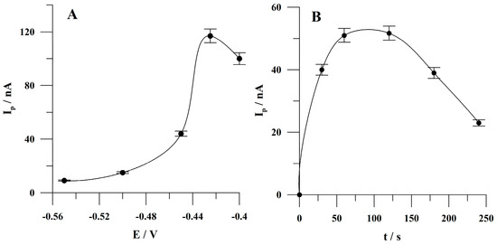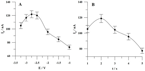 The so-called activation step has been previously introduced to voltammetric measurements in the course of using solid metal electrodes [39,40,41] for the preparation of their surfaces before the next measurement by reduction of metal oxides to the metallic state. These oxides can potentially be formed as a result of oxidation of electrode material with oxygen present in the analyzed solution. In the present study, activation was carried out as the first step of a standard measurement procedure. In the case of the present study, the activation potential was changed in the range from −1.0 to −3.25 V. The concentration of Sunset Yellow was 5 × 10−8 mol L−1. The obtained results are shown in Figure 4A. It was observed that the peak current of Sunset Yellow increased as the activation potential was changed from −1.0 to −2.75 V and then slightly decreased at more negative potential values. Further studies were performed at the activation potential of −2.75 V as an optimal value. In such conditions, a reduction of hydrogen ions occurs; however, as was previously reported [44], accumulation conducted even at such negative potential values when using microelectrodes leads to reproducible results.