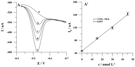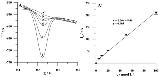 After the optimization of the main measurement conditions, calibration studies were performed. The calibration plot for an accumulation time of 60 s was a straight line from 5 × 10−9 to 1 × 10−7 mol L−1 of Sunset Yellow and obeyed the equation y = 2.06× + 8.06, where y and x are the peak current (expressed in nA) and the Sunset Yellow concentration (expressed in nmol L−1), respectively. The linear correlation coefficient r was 0.995. The relative standard deviation for the determination of Sunset Yellow at a concentration of 2 × 10−8 mol L−1 was 4.1% (n = 7). The limit of detection, estimated as three times the standard deviation of the intercept divided by the slope of the calibration graph, was 2.1 × 10−9 mol L−1 (accumulation time 60 s). Voltammograms obtained for increasing concentrations of Sunset Yellow are presented in Figure 6A. The corresponding calibration graph is shown in Figure 6A’.