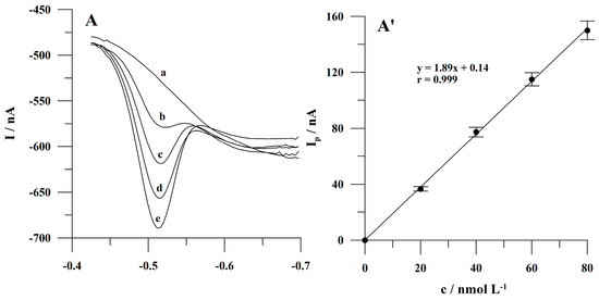 A practical application of the developed voltammetric procedure was also examined by conducting recovery studies from the environmental water samples collected from the Bystrzyca River (a river located in the eastern regions of Poland) that was spiked with a fixed concentration of Sunset Yellow. The dilution factor of the natural water sample was equal to 2. A natural water sample was analyzed using the standard addition method (accumulation time was 60 s). The obtained voltammograms are shown in Figure 8A. The corresponding standard addition graph is presented in Figure 8A’. The average recovery values were in the range from 96.5 to 102% with a relative standard deviation (RSD) of 4.1%. The obtained results confirmed the applicability of the developed analytical procedure for the determination of Sunset Yellow in real water samples.