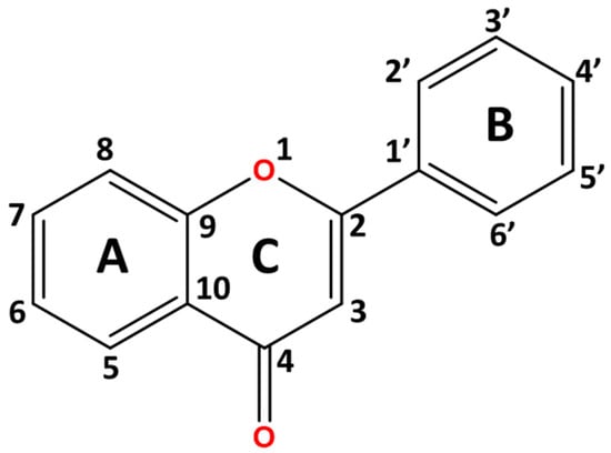 Flavones, a prominent subclass within the flavonoid family, exhibit a multi-target pharmacological profile owing to their intricate structural system. This structure features a chromone core (1-benzopyran-4-one) with a hydrophobic phenyl ring attached to the pyran ring (Figure 1) [1]. The unique pharmacological properties of natural flavonoid, particularly flavones, contribute to its diverse bioactivities in both traditional therapies and modern medicine [2,3,4,5]. The physicochemical properties of these flavones are largely attributed to two major groups that coexist, predominantly the natural methoxy and hydroxy substituents [6,7]. Both groups exhibit distinct characteristics and work synergistically in an electron donor–acceptor mechanism, influencing electron density distribution depending on their position in rings A, B, and C of the flavone structure [8,9,10]. As a result, the flavone pharmacophores significantly influence the bioavailability of flavones, one of the primary focuses in discovering potential therapeutic drugs [11]. Drug discovery originating from medicinal plants has fruitfully developed new potent therapeutics, such as morphine, an alkaloid derived from Papaver somniferum (opium poppy) [12]. Similarly, the discovery of taxol, a terpenoid compound from Taxus brevifolia (pacific yew tree) led to the commercialization of paclitaxel as an antitumor drug [13]. Despite the reported biological efficacy of flavones, a comprehensive systematic review authored by Xu et al. [14] highlighted significant challenges in developing anti-tumor drugs based on flavones aglycones. These challenges are often due to physical and structural limitations that affect the bioavailability. Thus, efforts to delve into the chemistry of highly lipophilic flavones were enormous, particularly focusing on the hydrophobic region such as the unsaturated double bond between C2 and C3 on ring C and phenyl ring B.