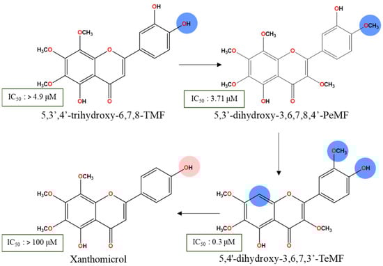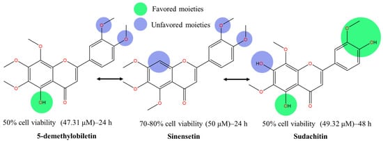 The influence of the position of both functional groups in ring B on the IC50 value in MCF-7 in 72 h treatment duration [47,48,49]. The presence of both methoxy and hydroxy moieties on neighboring positions (C3′ and C4′) is a crucial factor for a stronger IC50 of 5-OH methoxyflavones analogs. The C6,7,8-OCH3 plays a crucial role in stabilizing the lipophilic capacity of ring A flavones. Given the presence of C6 and C7-OCH3, the reduction of single C8-OCH3 will not significantly affect the IC50 of these scaffolds. For xanthomicrol, the absence of methoxy adjacent to the C4′-OH was a single factor in the expected weak cytotoxicity profile.