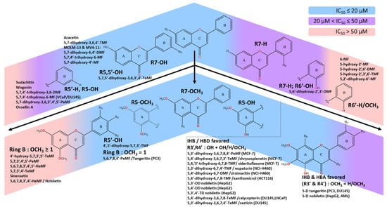 Ring B dihydroxylated moieties highlight the impact of C5′ scaffold composition to the cytotoxic effect on HCC1954 breast cancer cell lines [64]. The presence of C5-OCH3 shows enhanced cytotoxicity similar to the C5-OH methoxyflavones scaffolds, influenced by C5′-OH. As summarized in Figure 3, an excessive methoxylated effect on ring B yielded a negative IC50 result on cancer cell lines.