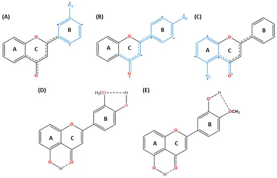 Lewis’s resonance structures illustrating electron delocalization in (A) C3′, (B) C4′, and (C) C5 free radicals. Ring AC and BC are not conjugated. According to a 2013 study, a strong IHB between C5-OH and the C4 oxygen atom of the carbonyl group facilitates the formation of IHBs involving (D) C4′-OH and (E) C3′-OH with an adjacent methoxy groups.