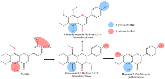 Breast cancer cell lines were among the most extensively studied on the cytotoxic capacity of methoxyflavones analogs. Sideritoflavone, 5,3′,4′-trihydroxy-6,7,8-TMF, demonstrated a strong cytotoxic effect on MCF-7 cell lines after a 72 h treatment, with an IC50 of 4.9 μM [47]. By replacing C4′-OH with the methoxy group (Figure 2), the compound 5,3′-dihydroxy-3,6,7,8,4′-PeMF, isolated from Glycosmis ovoidea, demonstrated stronger IC50 values of 3.71 μM in a similar treatment duration [48]. Signs of apoptosis such as cell membrane blebbing, shrinkage, and fragmentation were observed. A loss of mitochondrial membrane potential at concentrations of 2 and 20 μM was noted, indicating that intrinsic apoptosis had occurred [49].