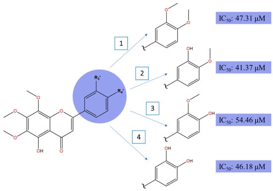 SAR analysis on cytotoxicity activities of 5-demethylnobiletin derivatives on HepG2 liver cancer cell lines in 24 h treatment [91]. Each derivative (1–4) shows a different substitution pattern on the ring B methoxyflavone structure. The IC50 values adjacent to each structure illustrate the effect of these modifications on cytotoxic efficacy. Notably, derivative 2 with a hydroxyl group at position R3′ shows the lowest IC50 value of 41.37 µM, suggesting increased efficacy compared to other derivatives.