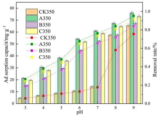 4.4.3. The Influence of the Initial Solution pH Value on the Adsorption Experiment