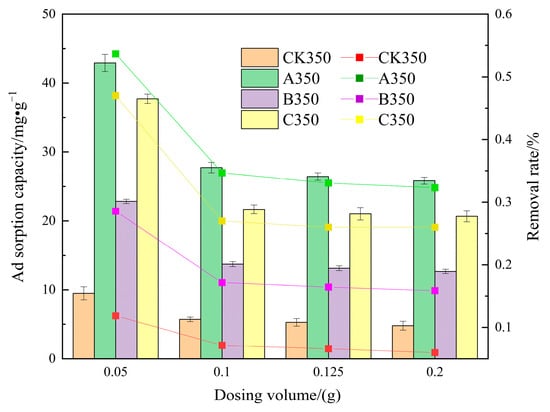 2.2.4. The Effect of Dosage on the Adsorption of Cd2+ by Selenium-Modified Rice Husk Biochar
