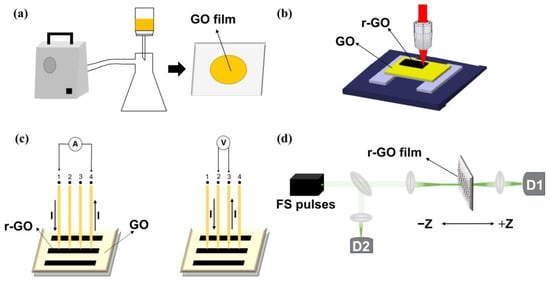 (a) Preparation process of GO films. (b) Schematic diagram of the detailed process of femtosecond laser direct write ablation of GO. (c) Schematic diagram of sheet resistance measurement of r-GO film using a 4-point probe station, and each metal probe (Cu-Au-plated) has a size of 0.74 mm. The arrows represent the direction of the electric current. (d) Schematic diagram of measurement of ONL of GO/r-GO film.