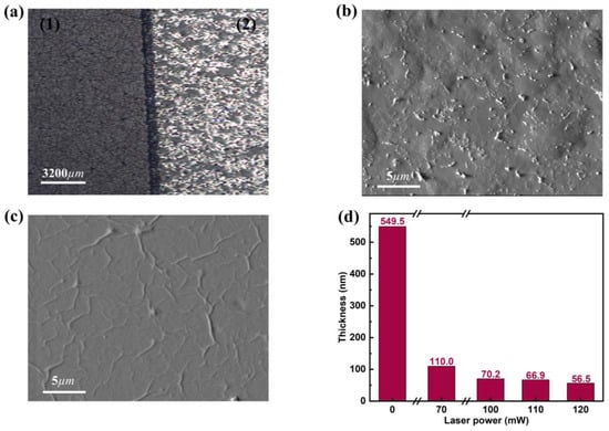 (a) GO/r-GO optical microscope images at a scale of 3200 µm, (1) for GO and (2) for r-GO. (b) SEM image of GO thin film after femtosecond laser processing with a scale bar of 5 µm. (c) SEM image of pristine GO film with a scale bar of 5 µm. (d) Stylus profilometer results of GO films fabricated with different laser powers; the thickness of the original GO film is ~549.5 nm.