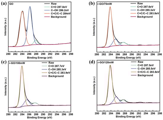 The chemical element valence states and chemical compositions of GO/r-GO were analyzed by X-ray photoelectron spectroscopy (XPS) [21]. Figure 3b shows that the C1s in the r-GO films exhibit the characteristic configurations of sp2 and sp3 carbon, single-bonded carbon–oxygen (C–OH), and double-bonded carbon–oxygen (C=O) at 283.8 eV, 285.3 eV, and 287.6 eV, respectively [6,12]. Compared with pristine GO (Figure 3a), r-GO/70 mW (Figure 3b) exhibits reduced signal intensity at 285.3 eV and 287.6 eV, suggesting a reduction of oxygen-containing functional groups after laser action. As shown in Table 1, with the gradual increase in the femtosecond laser power, the content of C=C increases from 47.37% (GO) to 79.07% (r-GO/120 mW), and the content of C–OH decreases from 48.10% (GO) to 13.73% (r-GO/120 mW). The results show that with the increase in laser power, the content of oxygen-containing functional groups gradually decreases, and the degree of reduction in GO films increases gradually.
