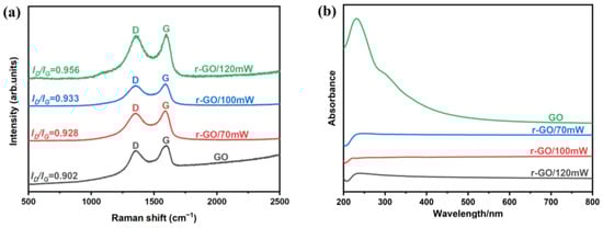 (a) Raman spectral characterization results of GO, r-GO/70 mW, r-GO/100 mW, and r-GO/120 mW. (b) UV-vis absorption spectra of GO, r-GO/70 mW, r-GO/100 mW, and r-GO/120 mW.
