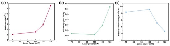(a) Resistance results of r-GO/70 mW, r-GO/100 mW, r-GO/110 mW, and r-GO/120 mW measured by 4-point probe station method. (b) Relationship between laser power and resistivity. (c) Relationship between laser power and electric conductivity.