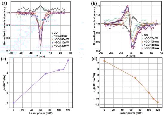 Here, GO and r-GO films were measured using the Z-scan technique to analyze the relationship between laser power and ONL. As shown in Figure 6a,b, the nonlinear saturated absorption and self-defocusing effects are observed in GO films after femtosecond laser processing. The open-aperture Z-scan measurements at the same input flux (Figure 6a) show a peak value of 1.015 for GO and valleys of 0.74, 0.794, 0.879, and 0.935 for r-GO, respectively, indicating a more pronounced nonlinear saturated absorption phenomenon compared to GO films and r-GO films. As shown in Figure 6b, the peak–valley difference is 0.207 for GO and 0.438, 0.533, 0.797, and 0.799 for r-GO for close-aperture Z-scan measurements at the same input flux. The self-defocusing phenomenon for r-GO/120 mW is 1.6 times that of r-GO/70 mW (2.5 times that of self-defocusing). Therefore, it is possible to control the ONL intensity of the r-GO film by adjusting the laser power.